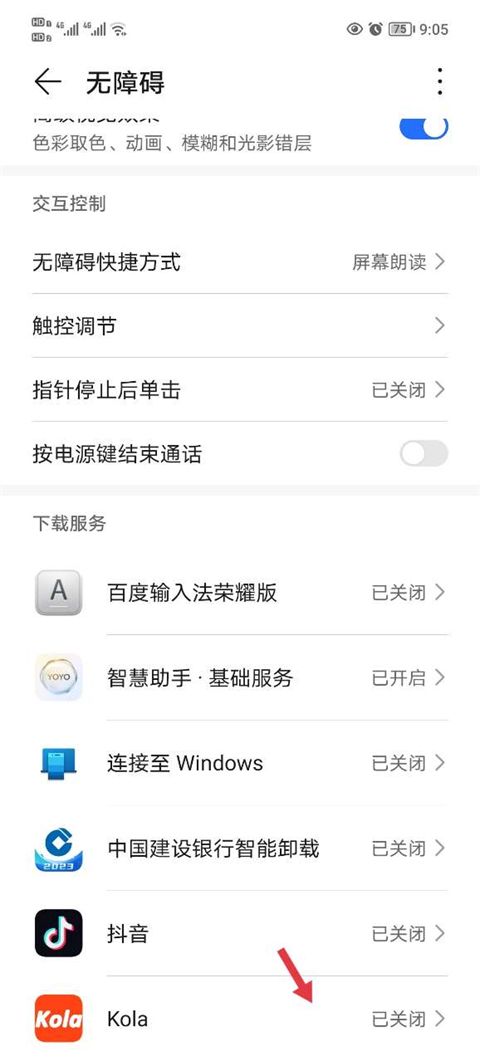2、点击无障碍服务去开启之后,就会来到设置中的无障碍选项,找到kola应用点击。
