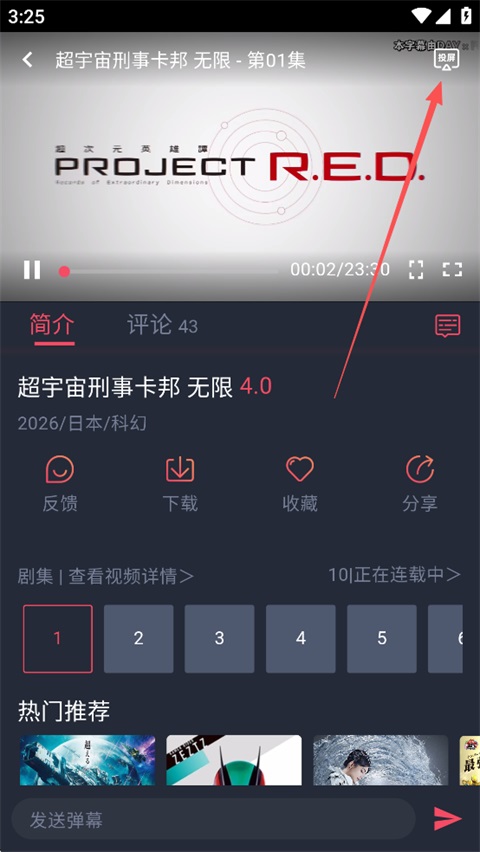 1、播放想要投屏的动漫,点击右上角投屏