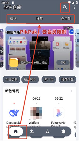 1、你可以在主页【精选】【推荐】【应用集】或是快捷搜索的方式来找到需要的应用或游戏。