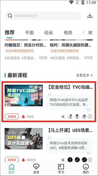 1、首先,打开站酷高高手官方app,在首页找到并点击最新课程中的某节直播课;