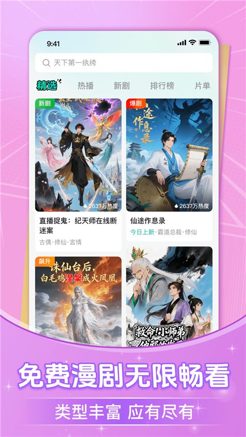 免费漫剧看剧App是一款可以免费看漫剧的软件,涵盖了沙雕、悬疑、重生、仙侠、古风等多种题材,满足不同类型剧迷的需求,而且软件内的漫剧可以免费畅享,没有任何门槛。在使用免费漫剧看剧App时,你可以轻松上下滑动切换集数,快速跳到下一集,播放速度还能根据自己的观看习惯自由调整,追剧过程更加轻松畅快,软件还会根据大家的观看喜好,智能推荐你感兴趣的漫剧,让大家没有剧荒的困扰,欢迎各位小伙伴前来本站免费下载!