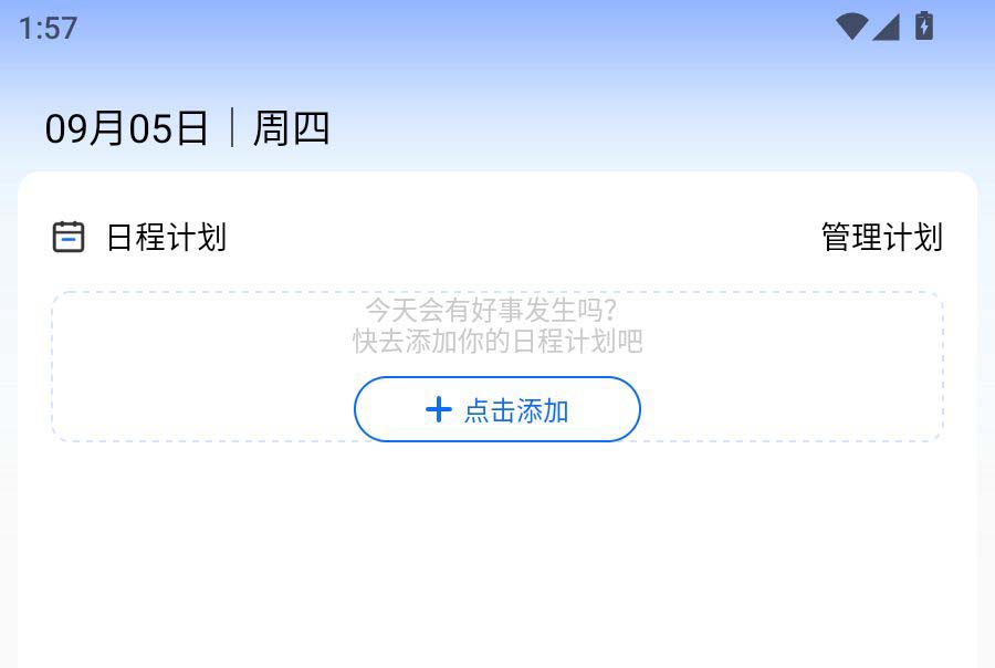 3、进入“日程计划”页面,可直接点击“+点击添加”按钮进入下一步;