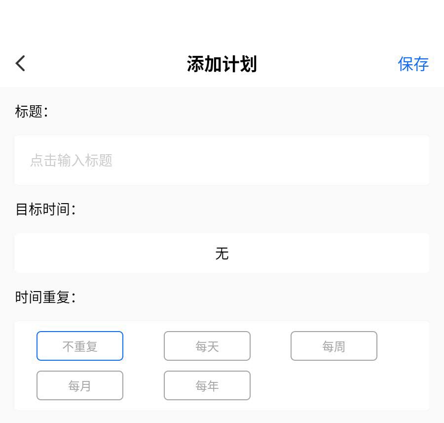 4、在“添加计划”页面,就能自定义编辑标题、时间等信息,最后点击右上角的“保存”即可完成;