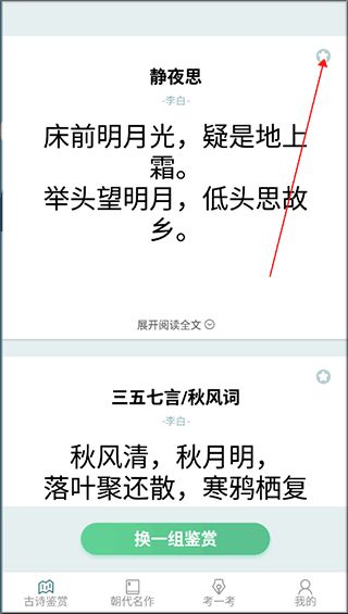 1、下载安装好多多高手app,进入软件点击故事鉴赏,可以观看许多的古诗并且点击右上角的五角星标志可以进行收藏。