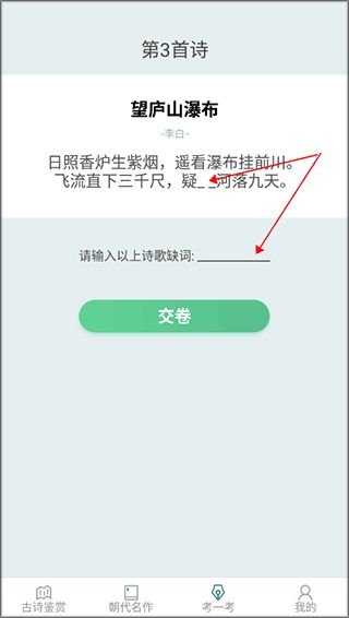 3、点击考一考可以进行古诗的答题,你需要输入正确的词。