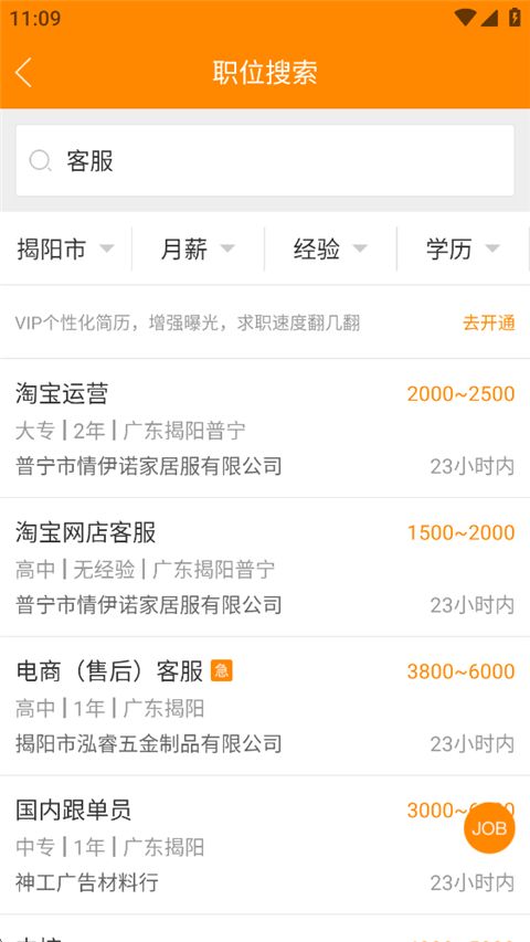 求职招聘宝App是雄鹰人才网专为广东地区打造的求职招聘手机客户端,依托城市站点,专注本地精准招聘服务。软件覆盖行业包括会计、销售、客服、外贸等,根据简历为求职者精准推荐职位,并且每天实时更新照片信息,保证求职者与招聘者掌握最新信息。求职者可按行业、地区、薪资、经验、学历等多维度自行筛选岗位,遇见心仪岗位可与招聘者在线沟通,详细了解岗位信息。