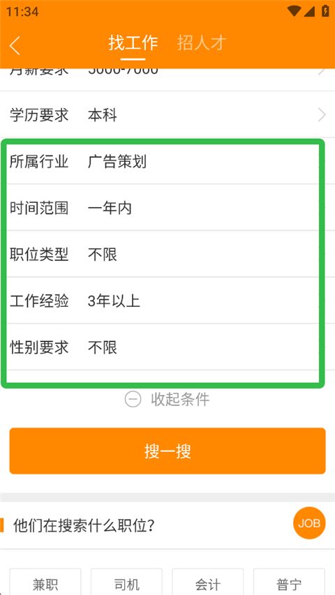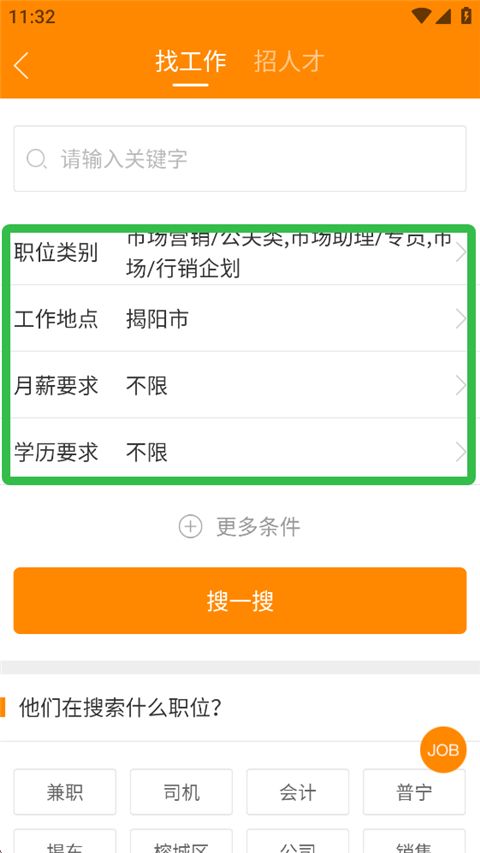 2、输入职位关键字,并根据自身情况选择职位以及工作地点、对月薪的要求等。