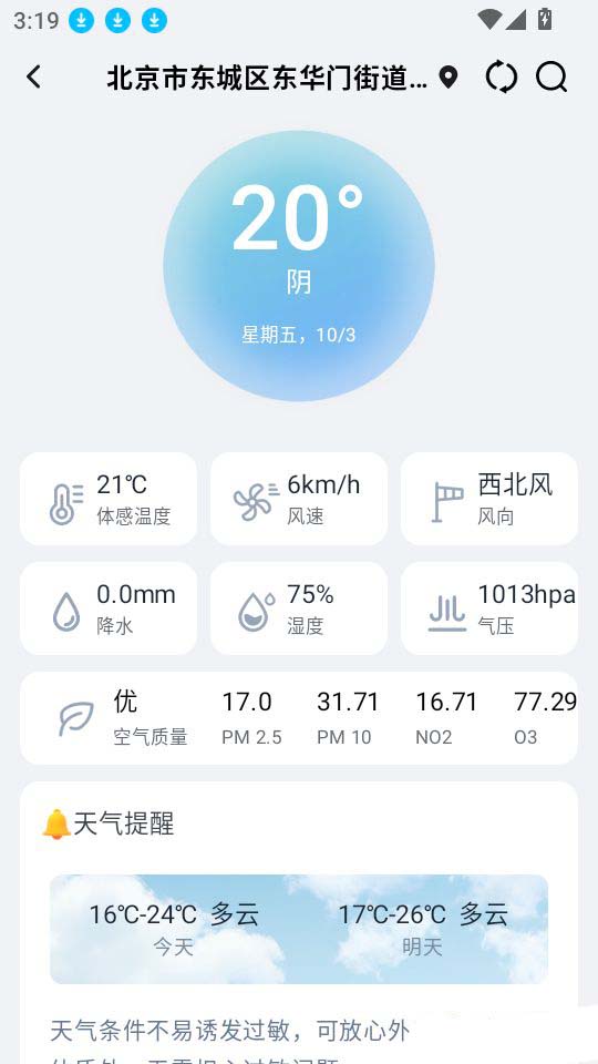 4、然后就可以看到当前城市的天气预报了,掌握实时的天气。