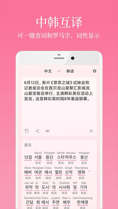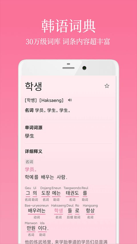 韩语学习君是一款很好用的韩语学习软件,具有完备的韩语词库可以让你快速的了解韩语,软件包含了发音、词源、词性、例句等一应俱全,无论是零基础的朋友还是有一定词汇量的朋友都可以进行学习,同时软件还有使用记忆遗忘曲线安排复习等多项功能,只要下载后跟着上面的教学方法一步一步来,保管用户快速入门,自由的寻找到适合自己的学习方式,合理科学的背词计划让各位韩语学习者背单词记得更牢固,体验到更加舒服精彩的学习内容,有需要的小伙伴快来下载试试吧!