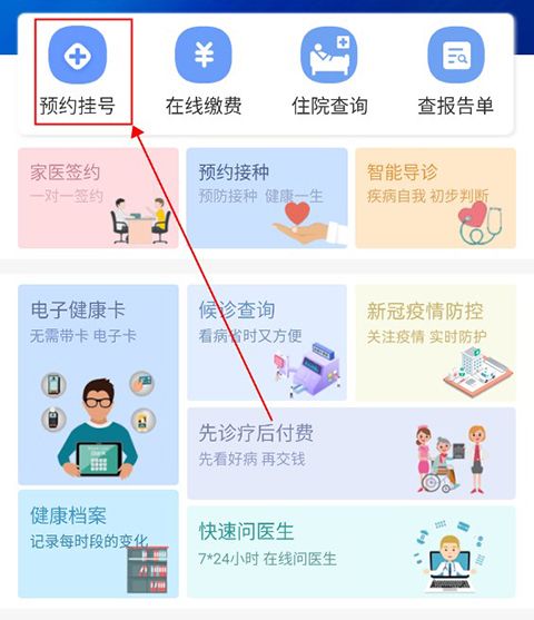1、首先用户在首页,可以点击上方的预约挂号。