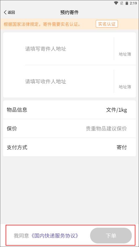 2、填写寄件人和收件人地址,添加物品的重量,最后点击下单即可。