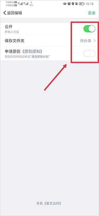 4、选择文章存放的文件夹,并开启申请原创的开关,最后点击发表即可