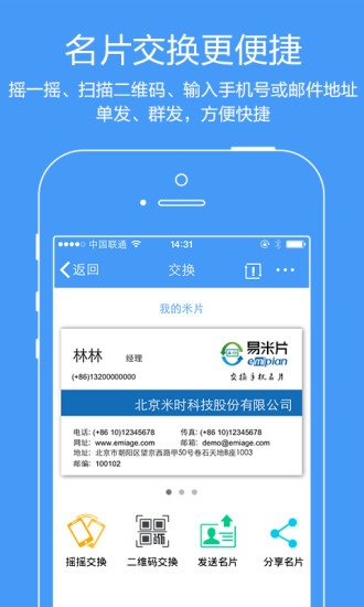 2.易米片秉承传统名片的基本属性,面向单位,传递商务信息,同时也具备个人社交属性。