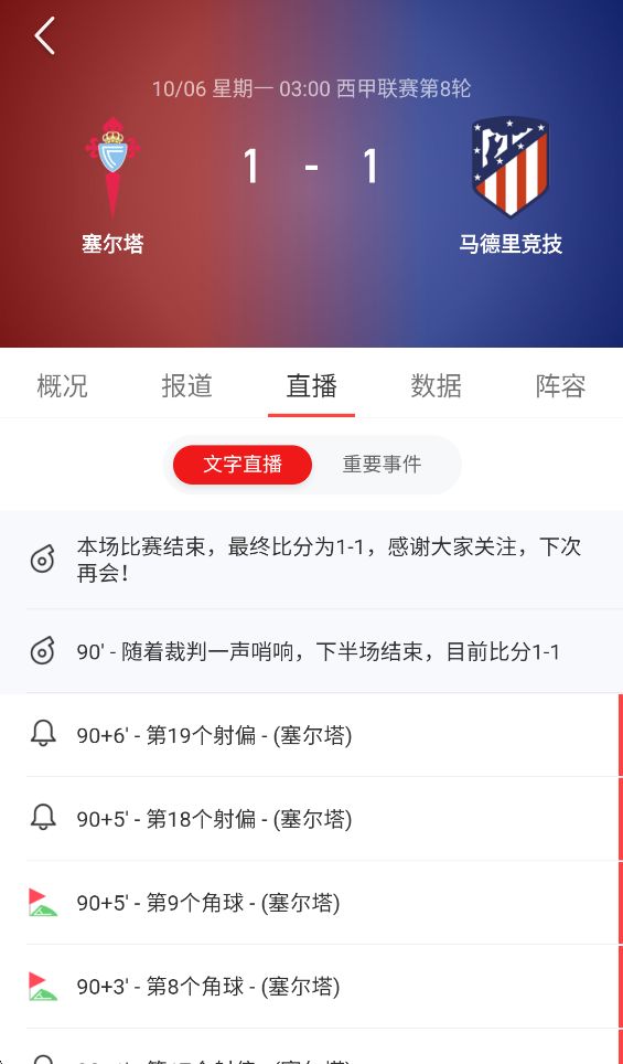 2、因为没有视频直播回放,所以我们只能查看该比赛的文字直播和重要事件。
