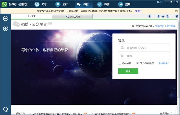 爱微帮媒体版是专门针对自媒体人或企业社交帐号管理者而开发,是一个内容管理和分发工具。可以离线编辑文章内容,也可以通过云服务在不同机器或不同成员间同步;并能便捷的发送到多个微信公众平台、新浪微博等社交网络帐号。