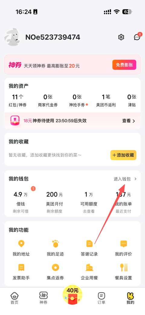 打开美团外卖APP,点击【我的】,然后选择【进入钱包】。