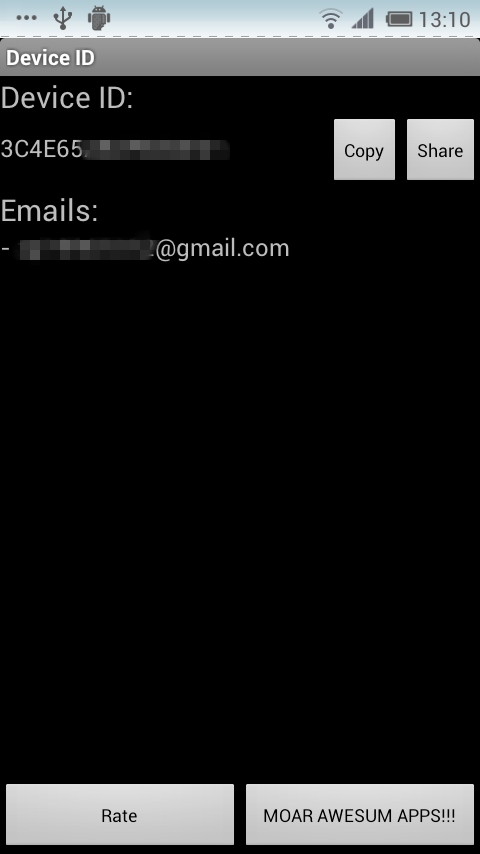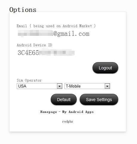 Email和Password分别填写你的Google帐号和密码,Android Device ID里填写你的安卓设备ID,如果你不知道设备ID请下载Device ID插件作者的这个Device ID软件得到你的设备ID(图4)。你还可以在登录后选择你要伪造的国家和运营商代码。