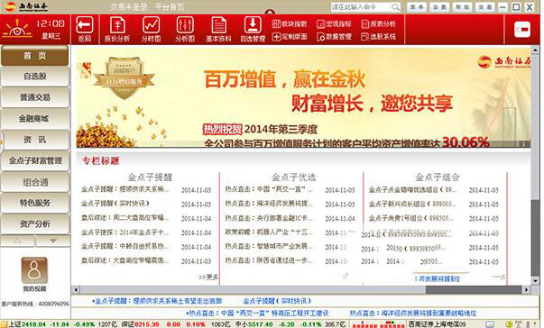 西南证券金点子财富管理终端是一个功能众多的证券软件.它集终端行情、 贸易、 信息、 服务、 财务管理于一个整体.它提供全方位的个性化的服务的财富管理平台。客户端是强大的和咨询服务,为您量身定做的理财服务。