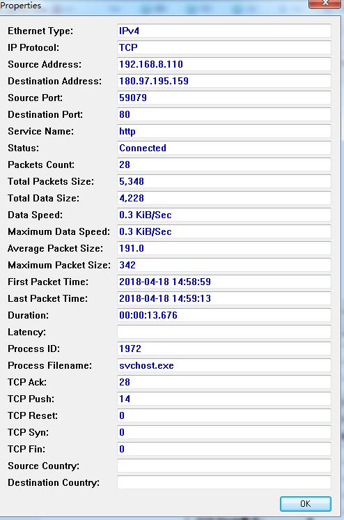 报文统计分组的以太网类型,IP协议,源/目的地址,源/目的端口。对于每一个统计数据线,将显示以下信息:(IPV4,IPV6,ARP),以太网类型,IP协议(TCP,UDP,ICMP),源地址,目的地址,源端口,目的端口,服务名称(HTTP,FTP,等),总包大小,数据包计数,总数据大小,数据传输速度,最大数据传输速度,平均包大小,第一个/最后包的时间,持续时间,进程ID/名称(TCP连接)。