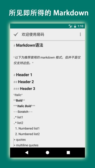 易码是一款简洁的笔记软件。摒弃文件夹的传统概念,以“库”为单位管理你的笔记。有点类似于“标签”概念,这样做的好处是你可以不用在手机上面对一层又一层文件夹列表,这在手机上是很费时间且不便捷的。