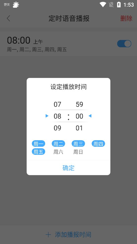 2、下载完成后进入语音播报页面,在这里默认是工作日的早上播报,用户可以自己添加播报时间。
