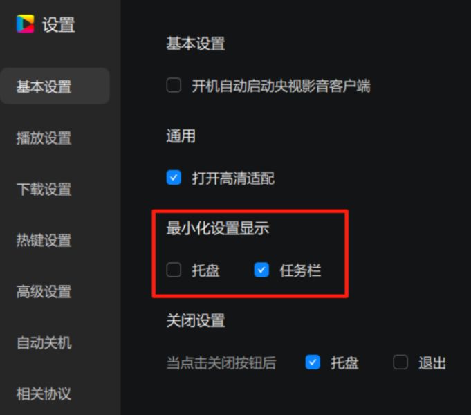 可通过单选按钮设置点击央视影音的关闭键是最小化到托盘还是直接退出央视影音程序。