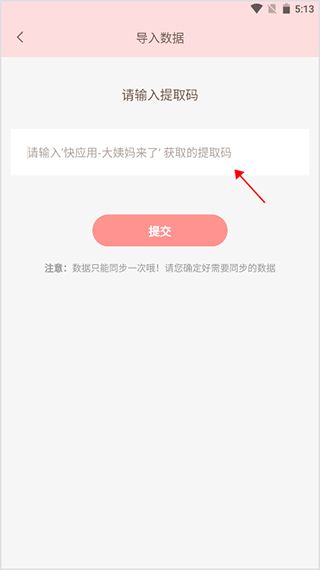 3、这时候输入“快应用-大姨妈来了”获取提取码,点击提交就可以导入数据了,不过数据只能同步一次,要谨慎使用。