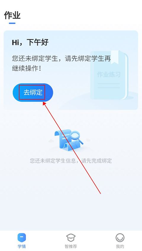 然后就可以绑定自己的学生信息啦,点击首页的“去绑定”即可。