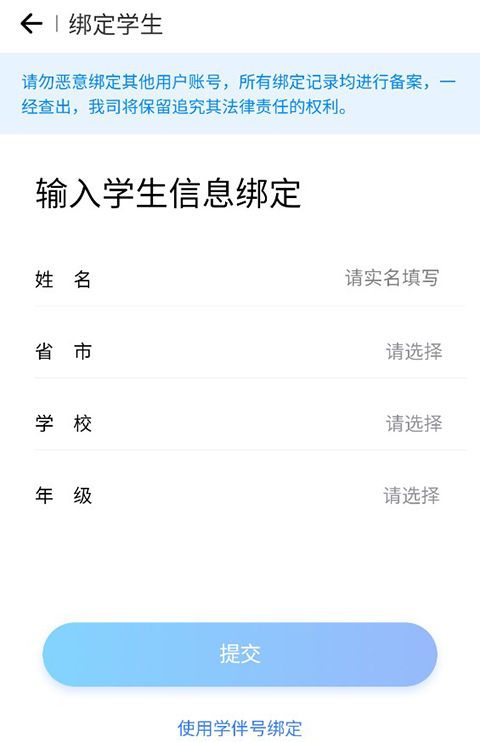 如果不知道自己的学伴号或者没有学伴号,也可以点击“提交”按钮下方的小蓝字,输入自己的学生信息也可以进行绑定。