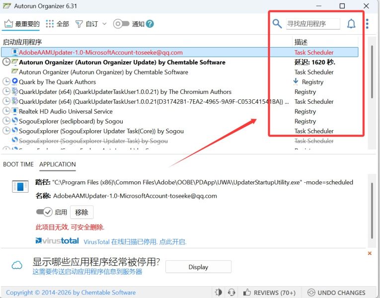 当选择名为Chemtable Startup Checking的自动运行管理器本身的服务条目时,底部面板中有关它的信息显示不正确。