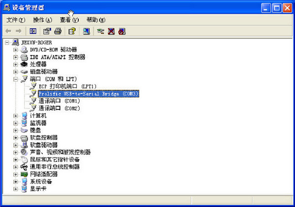 计算机重新启动后插入usb数据线,在控制面板的“系统”属性中的设备管理器的“端口”中可以看到USB转COM 的端口号。(如下图例的COM3)