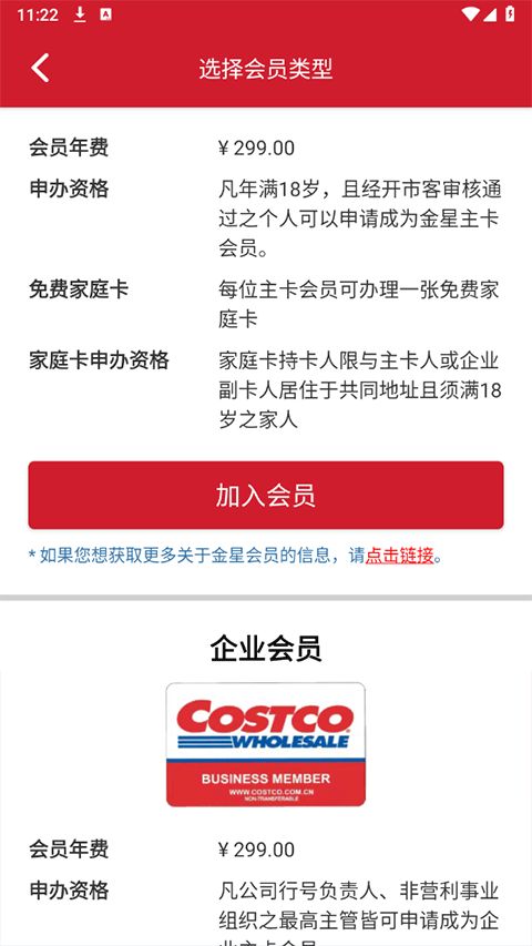2、开市客提供了两种会员类型,分别是金星会员和企业会员,两个会员申办的资格不同,选择符合资格的会员点击加入会员按钮