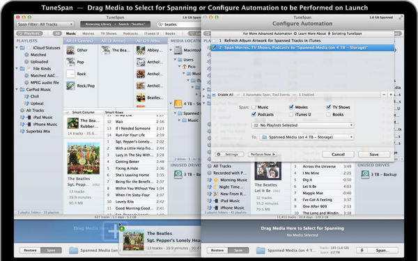 tunespan帮助你轻松地移动媒体文件(音乐,电影,等等)在您的iTunes库的多个驱动器,避免移动文件手动陷阱。tunespan可以让你浏览和跟踪你的iTunes图书馆媒体所有驱动器上,无论他们是连接或不连接,并使它清楚你到底是不是目前在iTunes。