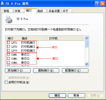 找到打印机TX 9 Pin,点右键选择:属性→端口→根据目前连接的数据线选择端口,并口选择LPT1/2/3,串口选择COM1/2/3,USB接口选择USB001/2/3