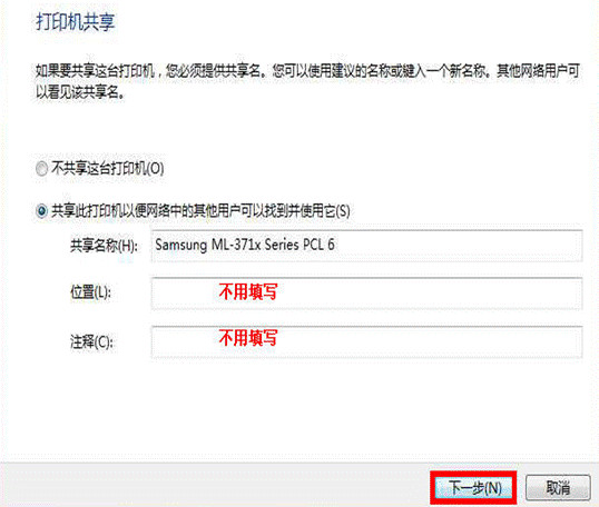 打印机共享(可以根据您的需要进行选择),其他地方不用填写,按照默认的点击“下一步”即可