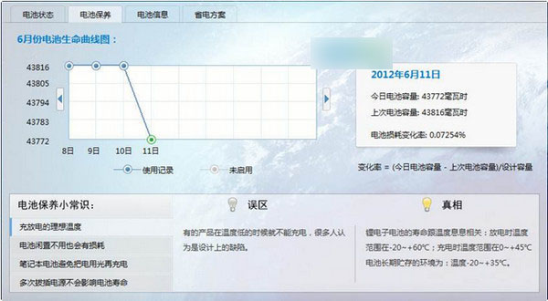 在电池保养区域,有很多关于电池如何保养的小技巧,以及大家对电池保养上面的误区,还有电池在一定时间段内的声明曲线图。