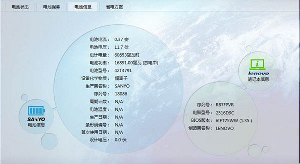 在电池信息区域内,可以清楚的了解到你电池的品牌以及各种信息,当然你的电脑牌子和型号都是可以一清二楚的看到的,不过有些信息还没有正常的显示,比如电池温度、生产日期、设计电压,毕竟这个还处于测试版,相信在正式版放出的时候,会有一定的改善的。
