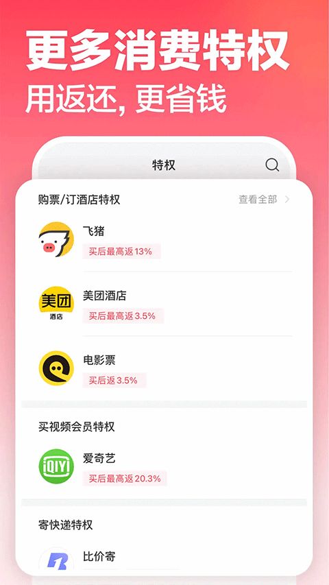 1、返还——淘宝天猫京东唯品会美团等+800家知名商城合作,购物返利随时随地,返利最高50%