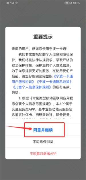 1、启动宁波一卡通应用后阅读相关协议政策,确认后点击同意并继续。