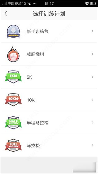 2、登录进咕咚的主界面后,我们会看到多种多样的选项,但是我们并不要着急地去点开它们,要一步一步地去设置才能更好的完成我们锻炼的定制,首先我们来到“运动”选项这里,划到第二页,进行训练计划的制定,一共有六种训练强度,分别是新手训练营、减肥燃脂等逐步递增,我们需选择适宜自身情况的情况进行参与,并设定参与的时间。