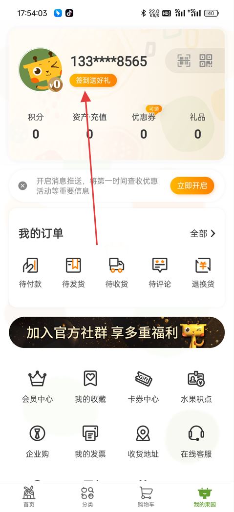 1、打开天天果园app,点击右下角【我的】进入个人中心。