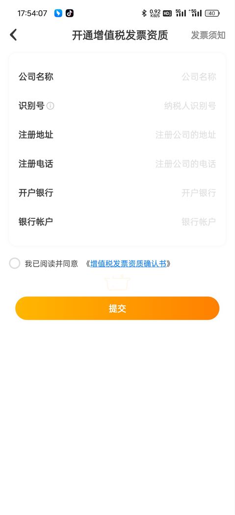 4、按提示填写相关开票资料,确认无误后提交即可完成开通。