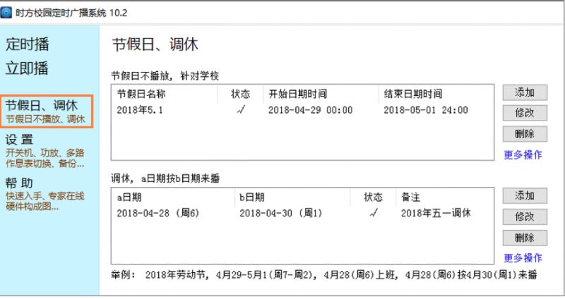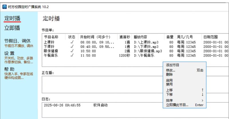 时方校园定时广播系统是专为学习量身打造的一款定时广播系统软件,用户可自定义添加上课铃、下课铃、眼保健操、课间操等铃声,并支持自定义设置播出时间、音量、播放时长、日期范围、遍首秒等信息,同时就算是学校节假日调休什么的也不用担心,这些也能根据自身要求来安排,而且支持一次性、每天、每周、每月定时广播,非常的方便,能很好的解决学校广播方面的问题,欢迎有兴趣的用户们免费下载体验。