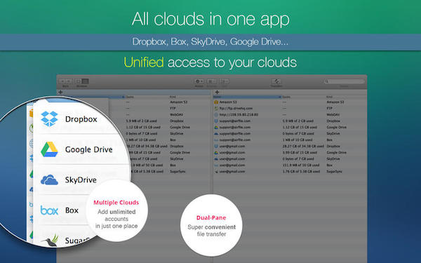 AirFile 是一款Mac上的网盘管理工具,由于目前网络云盘服务非常火热,几乎所有知名的公司都提供了云盘服务,但对用户来说,同时管理这些云盘就会很麻烦了,而AirFile就是一款帮助我们集中管理多个网络云盘的工具,唯一的不足是仅支持国外知名的云盘服务,比如Dropbox, Box, GoogleDrive, OneDrive等,而不支持国内的百度云、360云等,此外,还支持任意的FTP、SFTP、WebDAV服务,非常强大!