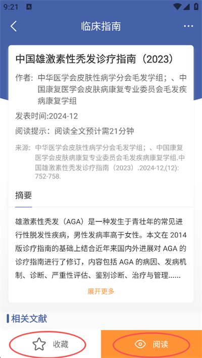 4、进入指南详情页,可查看摘要、作者、发表时间等信息;如需收藏,点击左下角"收藏"按钮;如需阅读全文,点击右下角"阅读"按钮完成操作。
