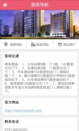 可以查询到达医院的乘车方案,医院内部楼层分布和科室位置,以及周边酒店、银行的地图信息等,方便患者就诊。