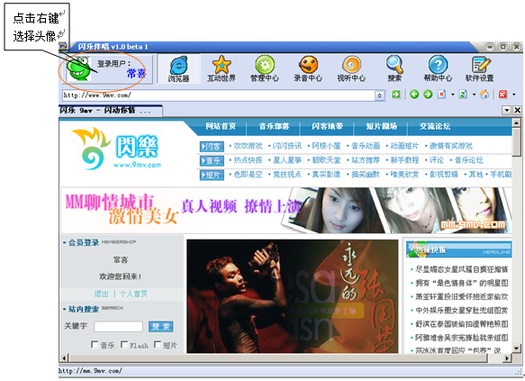 搜索:用户可以在这里搜索站内新闻、短片、FLAH、歌曲等。点击后会跳入浏览器进行浏览。