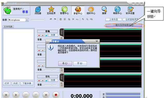 2、初学者可以点击“一键向导录制模式”进入一键向导录制流程。“一键向导模式”将带领用户学习从打开伴奏到拖入音轨、录制音频、保存文件、上传网站等一系列全套流程。点击对话框右上角的关闭按钮则可推出一键向导模式。
