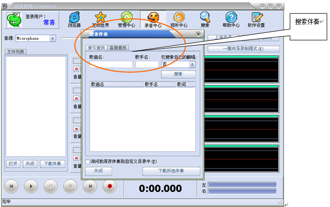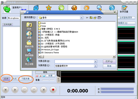 3、点击左下角的“打开”按钮,打开所需要的伴奏文件。您也可以点击“下载伴奏”按钮在网站上搜索您所需要的伴奏。