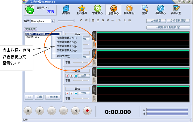 4、打开伴奏后,伴奏文件会显示在文件列表里面,用右键点击伴奏文件,可选择加载到任意音轨上,也可以把伴奏文拖放至音轨。